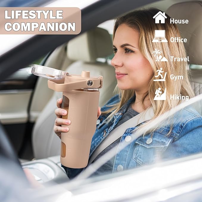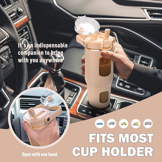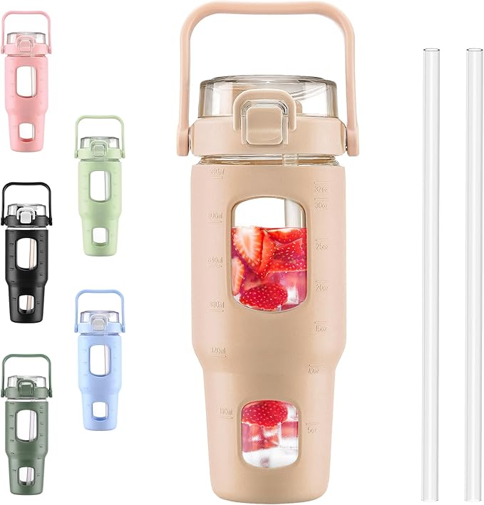 - Lockable & Leakproof Flip Lid: The handy, lockable flip lid prevents leaks and can be opened with one hand for those times when you’re on the move and your arms are full. Our leak-proof glass water bottle with straw makes your drinking dribble-free. The straw spout gives you a comfortable and quick drinking experience and this glass water bottles with time marker comes with 2 straws and 1 brush and the carrying handle on top makes it easy to tote around town.