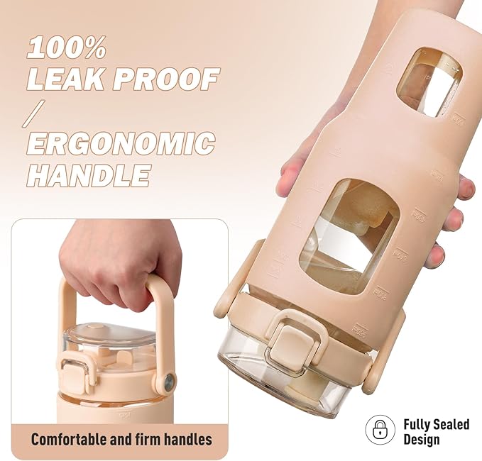 - Durable: The silicone sleeve covers most of the half gallon water bottle for protection. Not only does it keep your drinks cold for hours, but also makes this motivated glass water bottle more durable. The wide mouth of this huge glass water bottle makes it easier to refill large pieces of ice cubes and fruit, and with help of time and oz markers, you will easily track your daily water intake and drink more water throughout the day.