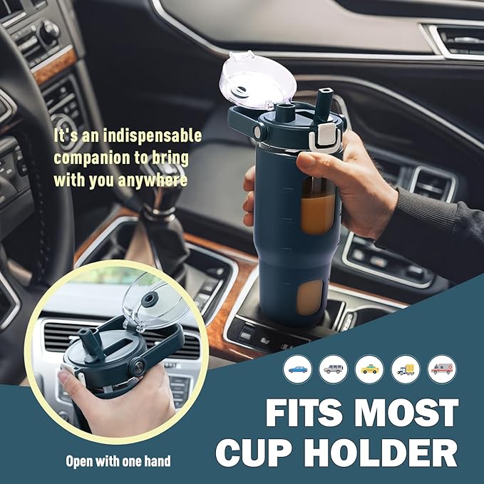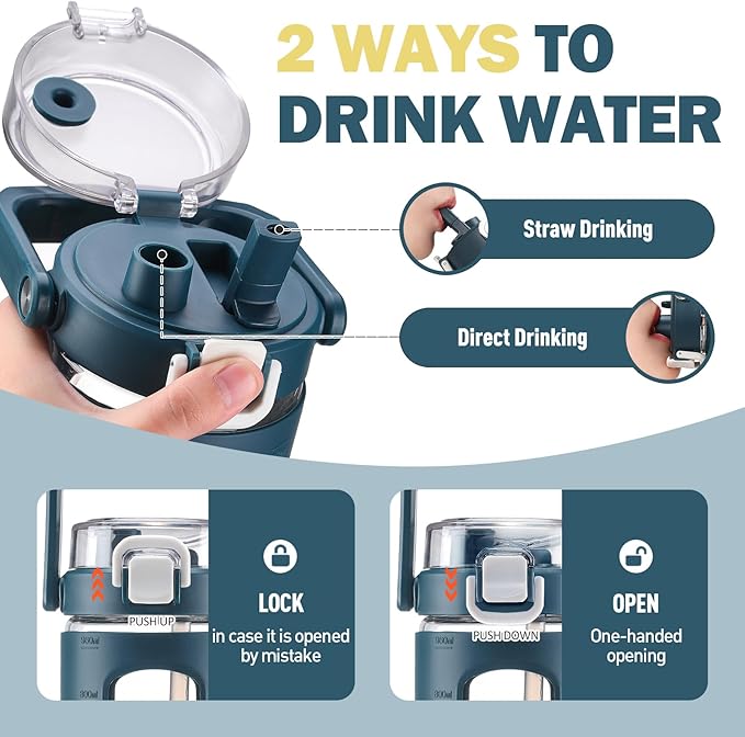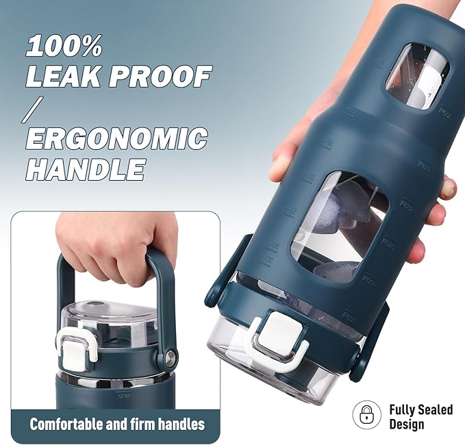- Lockable & Leakproof Flip Lid: The handy, lockable flip lid prevents leaks and can be opened with one hand for those times when you’re on the move and your arms are full. Our leak-proof glass water bottle with straw makes your drinking dribble-free. The straw spout gives you a comfortable and quick drinking experience and this glass water bottles with time marker comes with 2 straws and 1 brush and the carrying handle on top makes it easy to tote around town.