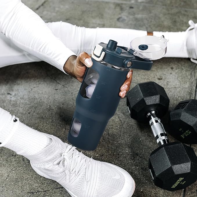 - Durable: The silicone sleeve covers most of the half gallon water bottle for protection. Not only does it keep your drinks cold for hours, but also makes this motivated glass water bottle more durable. The wide mouth of this huge glass water bottle makes it easier to refill large pieces of ice cubes and fruit, and with help of time and oz markers, you will easily track your daily water intake and drink more water throughout the day.
