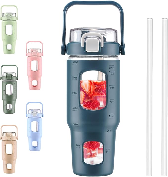 BLUEGO 32oz Glass Water Bottles with Straw Time Marker Half Gallon Large Motivational Water Bottle with Silicone Sleeve 2 Liter Large Glass Water Jug for Gym, Sports& Workout, Daily, Dark Blue
