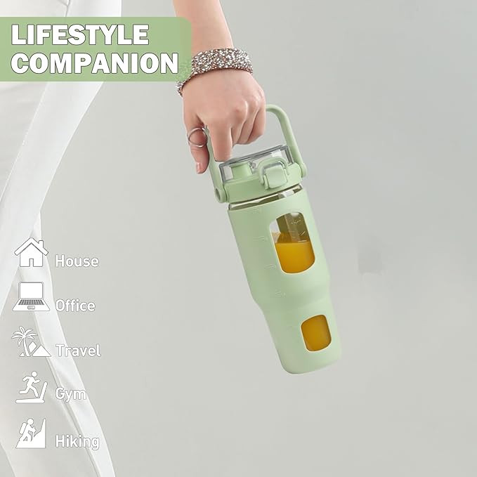 BLUEGO 32oz Glass Water Bottles with Straw Time Marker Half Gallon Large Motivational Water Bottle with Silicone Sleeve 2 Liter Large Glass Water Jug for Gym, Sports& Workout, Daily, Green