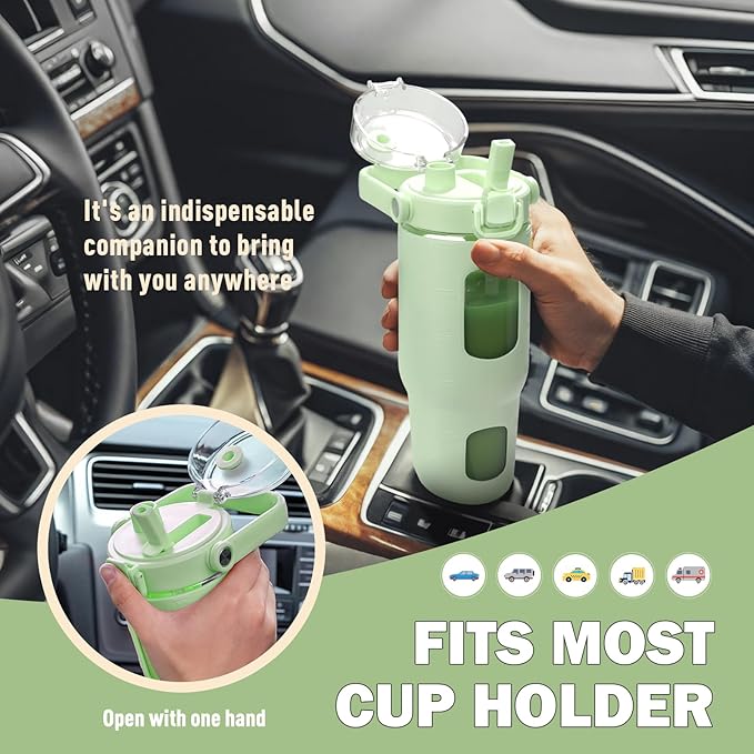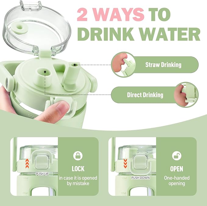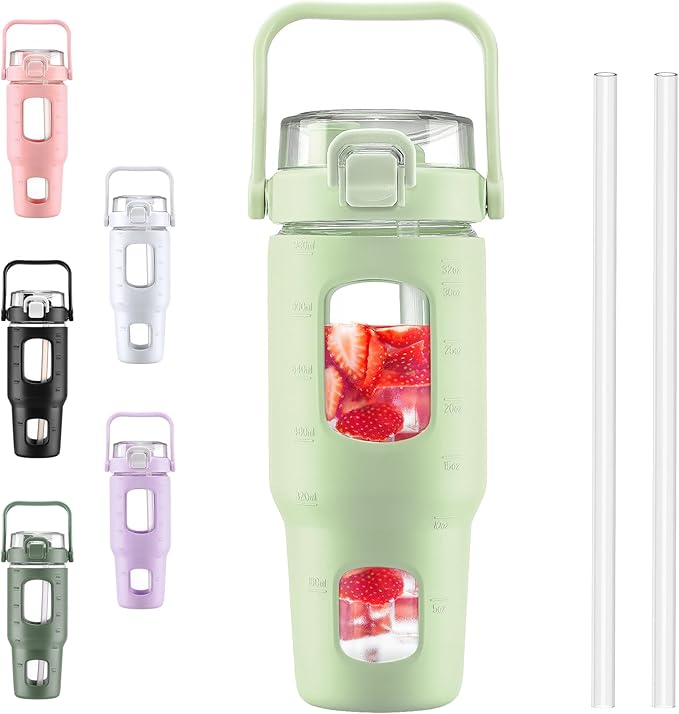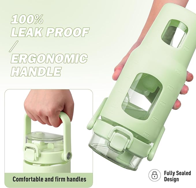 - Lockable & Leakproof Flip Lid: The handy, lockable flip lid prevents leaks and can be opened with one hand for those times when you’re on the move and your arms are full. Our leak-proof glass water bottle with straw makes your drinking dribble-free. The straw spout gives you a comfortable and quick drinking experience and this glass water bottles with time marker comes with 2 straws and 1 brush and the carrying handle on top makes it easy to tote around town.