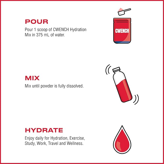- WHEN AND WHERE TO HYDRATE: Cwench Hydration Mix is great to keep at home or on the go, in your office, gym bag, one of your travel or camping essentials or staple in the team locker room, anytime through the day. Depending on the container (Tub or Packets), either add 1 scoop or a single Hydration Mix packet into a glass of water, mix, and hydrate. Cwench Hydration Mix is best prepared in our Cwench Team Bottle.