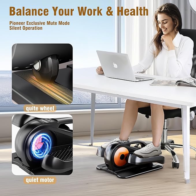 - [Pioneer Exclusive Mute Mode] Under desk elliptical is also a way to effortless weight losing while sitting in the office, and a good way to relax tight muscles in the legs and feet caused by prolonged sitting. Upgraded motor to run quietly without making noise, ensures a noiseless workout even at the highest speed. Considering the needs of the people who use a completely silent environment, press mute button when needed, you can adjust modes into the silent use function we just added