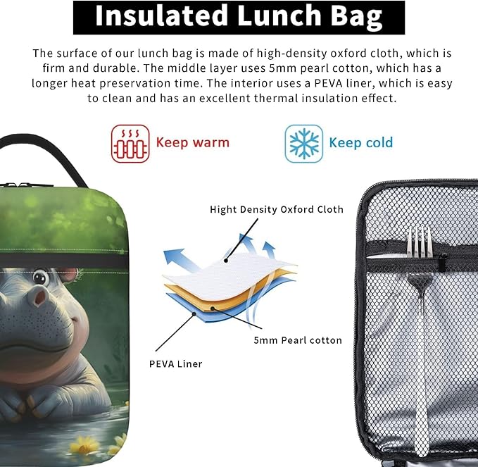 Insulated Lunch Box for Women Men, Hippo Theme Lunch Box Reusable Portable Lunch Bag Cooler Tote Waterproof Lunch Container for Office Picnic Work Travel