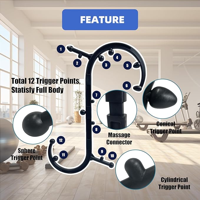 - 【12 Trigger Points, Multi Purpose】The massager has a total of 12 trigger points, including 3 different shapes, which can achieve different massage intensities. Combining the S-shaped curve shape, 12 trigger points can reach various parts such as the neck, back, shoulders, waist, legs, feet, etc.