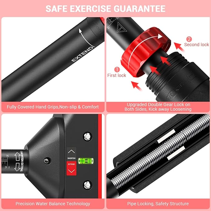 - Upgraded Mechanic Lock System: This push-up bar features a new 360-degree rotatable dual gear lock on both ends to protect the bar from loosening. The doorway exercise bar has passed extensive testing, ensuring safety and sturdiness for confident use