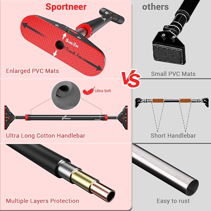 Pull Up Bar for Doorway: Sportneer Strength Training Pull-up Bars without Screw - Adjustable Width Locking Mechanism Chin Up Bar, Thickened Steel Max Limit 440 lbs Upper Body Fitness Pullup Bars for Home (Black-Red)