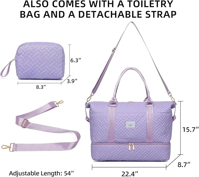 - TRAVEL DUFFLE BAG WITH SHOE COMPARTMENT - Travel bags for women has a shoe compartment to hold your shoes or dirty clothes, making it easy to separate them from your clean clothes when travelling. It also comes with a toiletry bag in which you can put your cosmetics, skincare products or toiletries.(Purple)