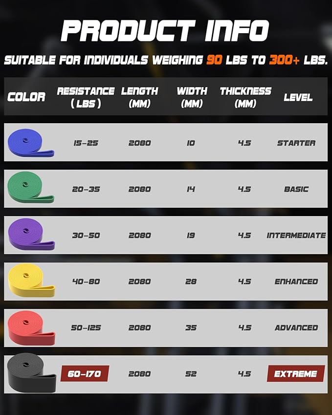 - 6 Resistance Levels: Our Pull Up Resistance Band Set includes 6 bands color-coded for different resistance levels: Blue (15-25 lbs), Green (20-35 lbs), Purple (30-50 lbs), Yellow (40-80 lbs), Red (50-125 lbs), and Black (60-170 lbs). Ideal for users weighing 90 lbs to 300+ lbs.