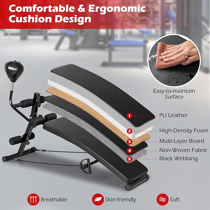 Goplus Adjustable Decline Sit Up Bench for Exercise, Foldable Curved Slant Bench with Speed Ball, Pump & 2 Resistance Bands, Heavy Duty Metal Frame, Full Body Ab Workout Equipment for Home Gym, Black