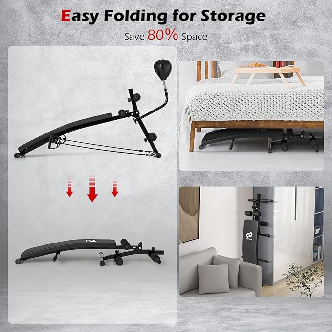 - Easy Folding for Storage: The curved slant board can be easily folded down into a narrow shape for compact storage, which will save 80% space when it is folded. You can store the folded workout bench in the cabinet or under the bed.