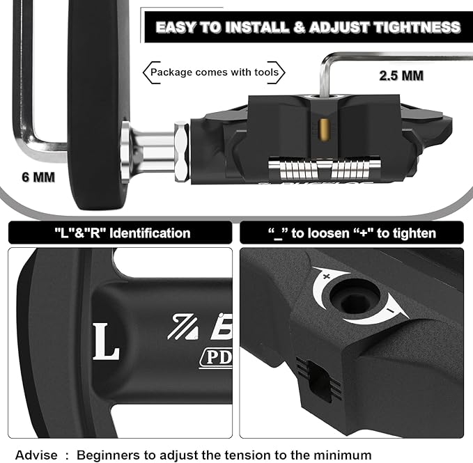 - 【Easy to Install】: The clipless bicycle pedals have a clear mark to identify the installation direction. "L" for left pedal, "R" for right pedal. No longer to worry about being unable to distinguish the direction of pedals! The tension can be adjusted according to different riding habits