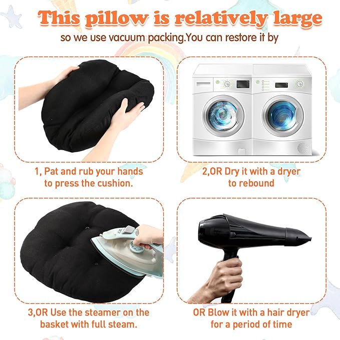 - Quality and Soft: the round floor pillow for kids is made of quality polyester fiber fabric, filled with soft and stretchy PP cotton, soft and safe, not easy to run cotton, not easy to deform or fade, and can serve for a long time; Please notice that due to vacuum pack, cushions can spring back to its normal shape about 1 day after opening