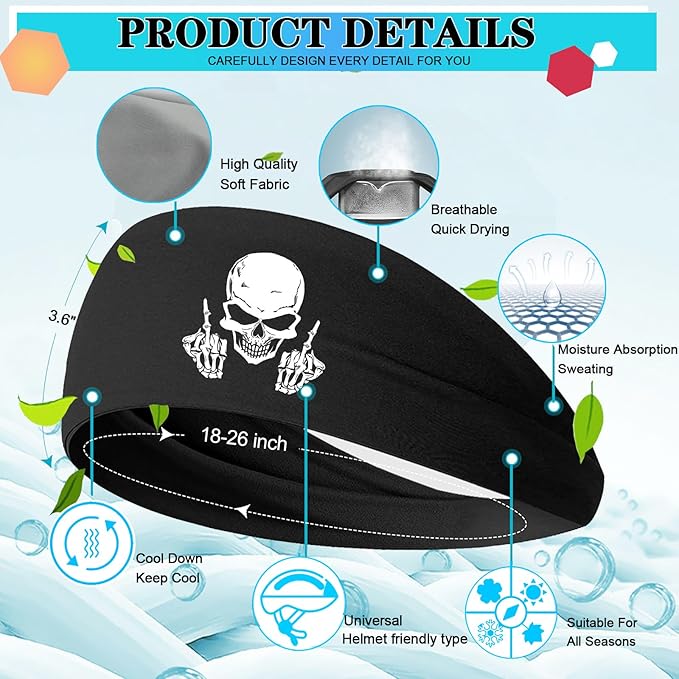- 【Wicking Quick-drying& Non Slip】Skull cooling headbands for men hair bands not only has a wicking and quick-drying designand protects the eyes, but also fixes the hair to prevent shading and protects the forehead from wind and sweat,keeping you fresh and dry during your workout. Stay in Place: Designed with a secure fit, our headbands stay put during intense workouts.