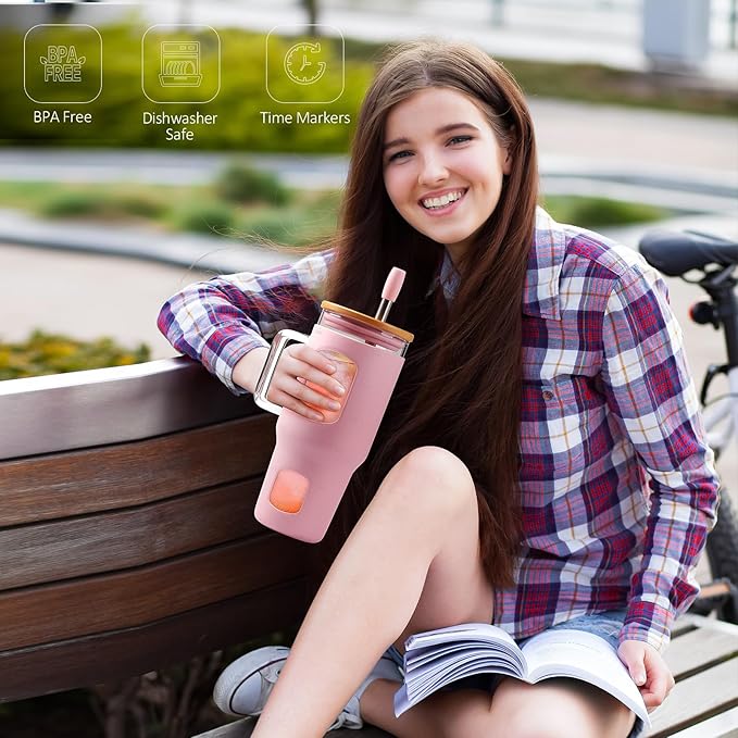 Glass Tumbler with Straw and Lid, 32 oz Glass Cup with Handle, Glass Water Bottles with Time Marker, 2 Straws - Pearl Straw & Drinking Straw Silicone Protective Sleeve-Pink