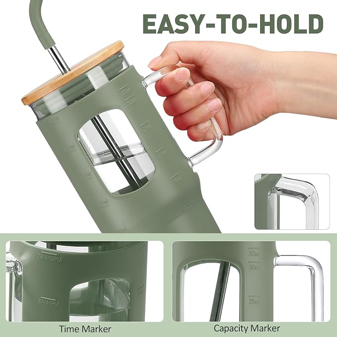 Glass Tumbler with Straw and Lid, 32 oz Glass Cup with Handle, Glass Water Bottles with Time Marker, 2 Straws - Pearl Straw & Drinking Straw Silicone Protective Sleeve-Olive