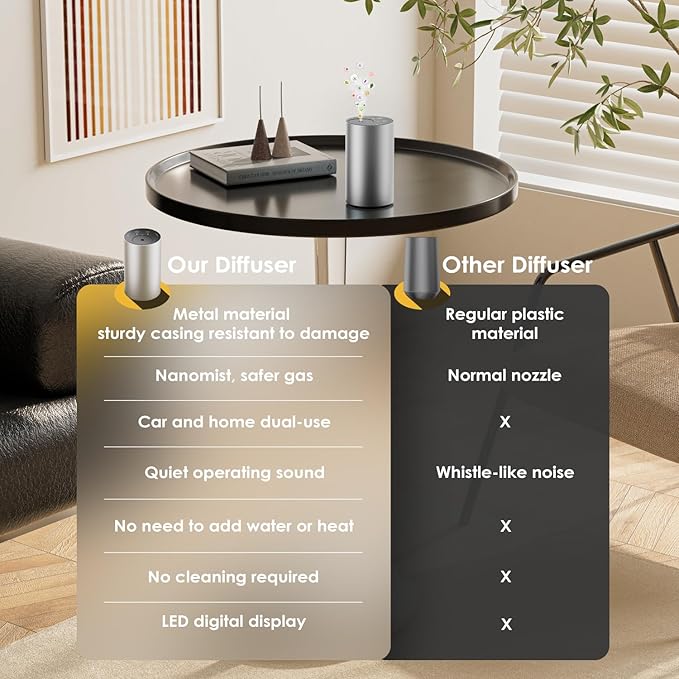 - Waterless Essential Oil Diffuser: Unlike traditional ultrasonic diffusers, Our Essential Oil Diffuser use nanotechnology to instantly compress essential oils into mist, quickly spreading the fragrance without the need for water or heat. Enjoy the aroma effortlessly. The Essential Oil Diffuser Large Room shell is made of high-quality metal, making it durable and resistant to damage. Powered by a 2000mAh battery, Cordless Aromatherapy Diffuser can easily last for 2-3 days of use.Note:(If leakage occurs, install the silicone ring gasket inside the fitting onto the top of the knob)