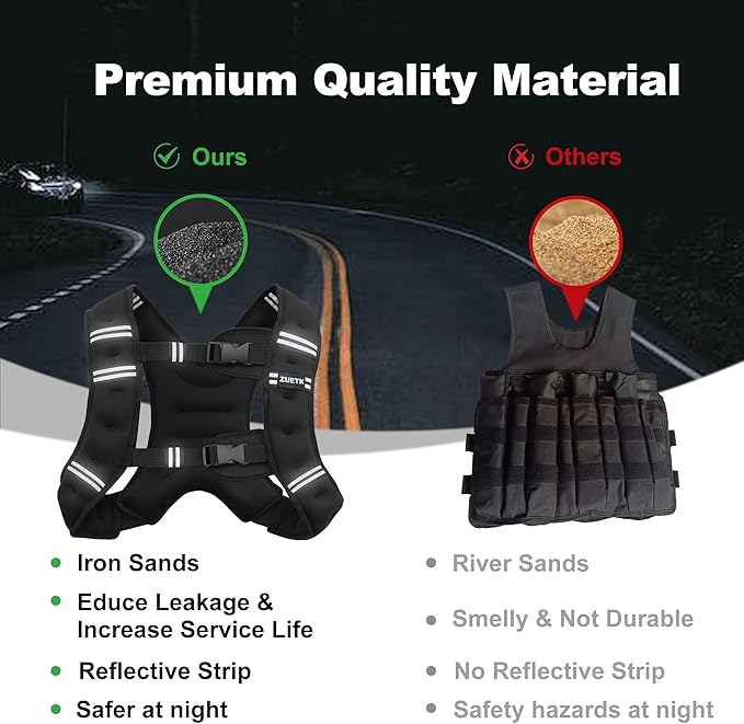 - Adjustable Straps & Reflective Stripes: Each weighted vest has adjustable straps to prevent slipping or sliding, ensuring a better fit for users of all chest sizes and improving exercise efficiency. The reflective strips on both sides of the weighted vest reflect vehicle headlights for safer night running, keeping you away from traffic accidents in any weather conditions (rain, fog, darkness), day or night