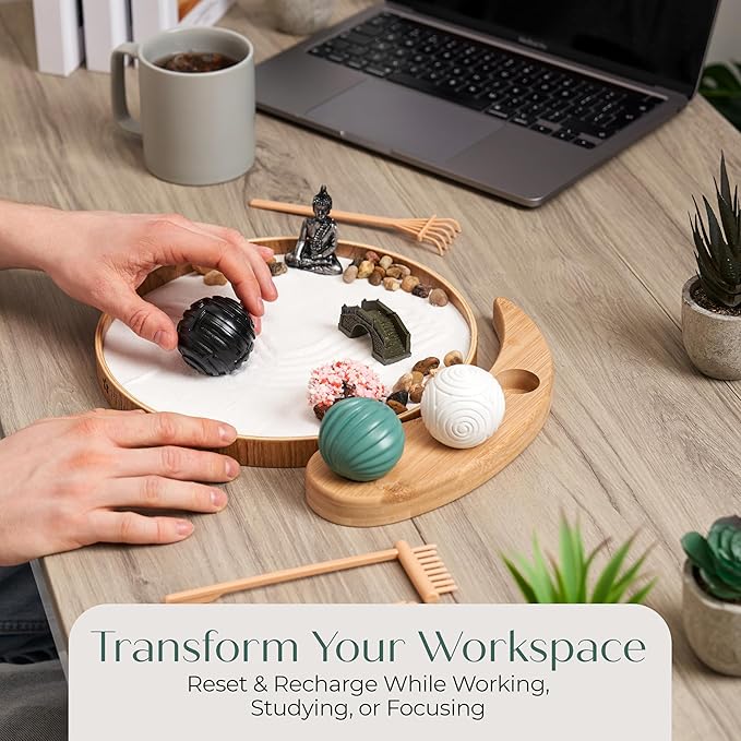 - MINDFULNESS BREAKS FOR WORK & STUDY: Why not reset and recharge between tasks by rearranging these mini zen garden accessories? Whether you're working, studying, or simply need a break from the screen, this desktop zen garden offers a soothing sensory experience to help you refocus, alleviate stress, and find your calm during those chaotic moments.