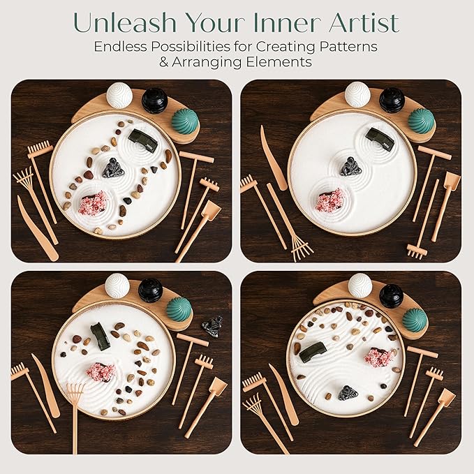 - UNLEASH YOUR INNER ARTIST: Design intricate patterns, arrange polished stones, and roll the sand balls in the Japanese sand garden to create mesmerizing landscapes in this decorative sand garden for desk. With miniature resin rakes and versatile tools, this kit inspires you to create beautiful art and provides limitless opportunities to express yourself while achieving a state of calm and mindfulness.