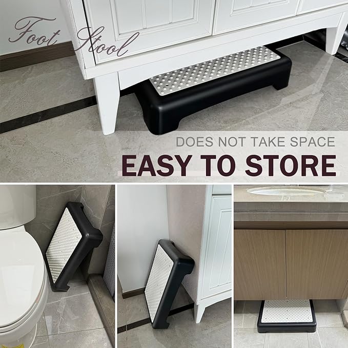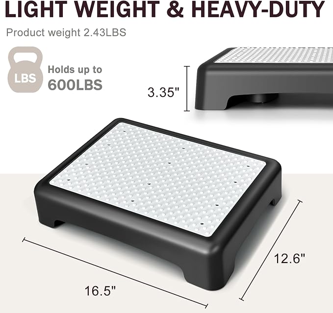 - 🚶️【Wide Platform & Short Height for Maximum Stability & Mobility Aid】With a low height of 3.35'' and a wide platform (16.5"L x 12.6"W), it further enhances stability during use. This low-height design is specifically tailored for the elderly and individuals with limited mobility, as it reduces the effort needed to lift their legs, making it easy for them to step on and off. It's a great mobility aid that helps them maintain independence in daily life, whether it's getting into bed, reaching for items in cabinets, or accessing the bathtub.