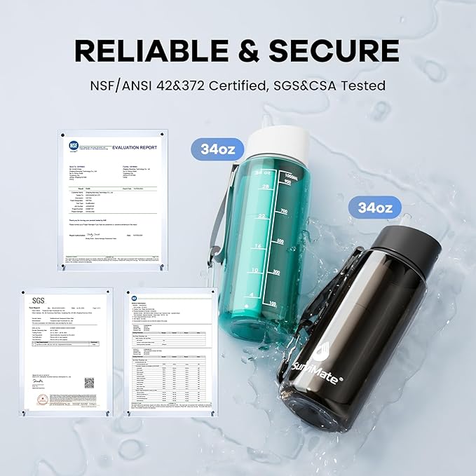 - 【5-Stage Filtration】:The Survimate water filter bottle adopts a composite filter technology, can reduce most contaminants. The filter element uses a coarse filter screen, a 0.01μm hollow fiber UF membrane, a sediment PP membrane, purification beads, and an activated carbon fiber to reduce chlorine, bad odor and intercept heavy metals, sediment, soil, organic matter and other impurities, etc.