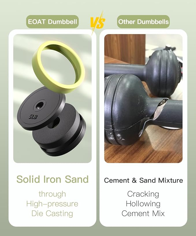 - Sturdy Quality Build: Unlike traditional cement-filled weights, our dumbbells are crafted from solid iron sand through high-pressure casting, providing superior durability and precise weight accuracy. Wrapped in thick 4mm TPR material, they are quieter, eco-friendly, and won't damage your floors. Plus, they require only 2Ft² of storage space!