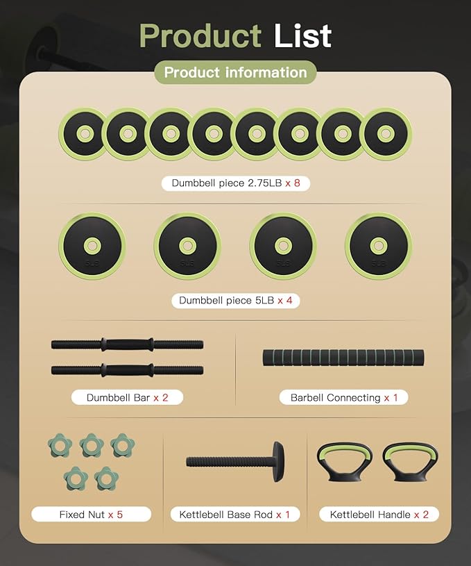 - Note: All dumbbell pieces weigh with all accessories weigh for a total weight of 45LBS. You will get 2.75LBS*8+5LBS*4 pieces plates, 2 dumbbell bars, 2 kettlebell handles, 1 kettlebell base, 1 barbell connecting and 5 pieces of nuts.