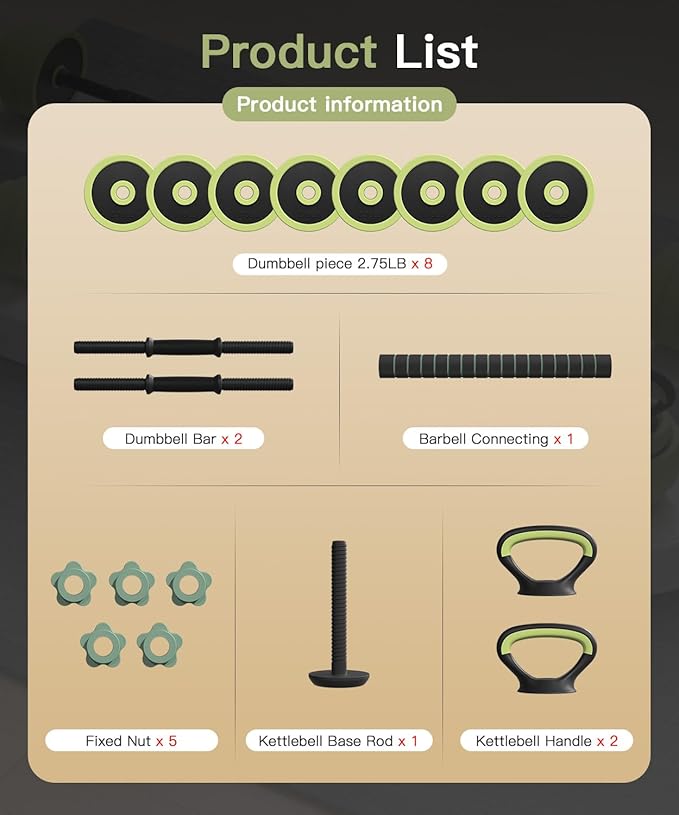 - Note: All dumbbell pieces weigh with all accessories weigh for a total weight of 25LBS. You will get 2.75LBS*8 pieces plates, 2 dumbbell bars, 2 kettlebell handles, 1 kettlebell base, 1 barbell connecting and 5 pieces of nuts.