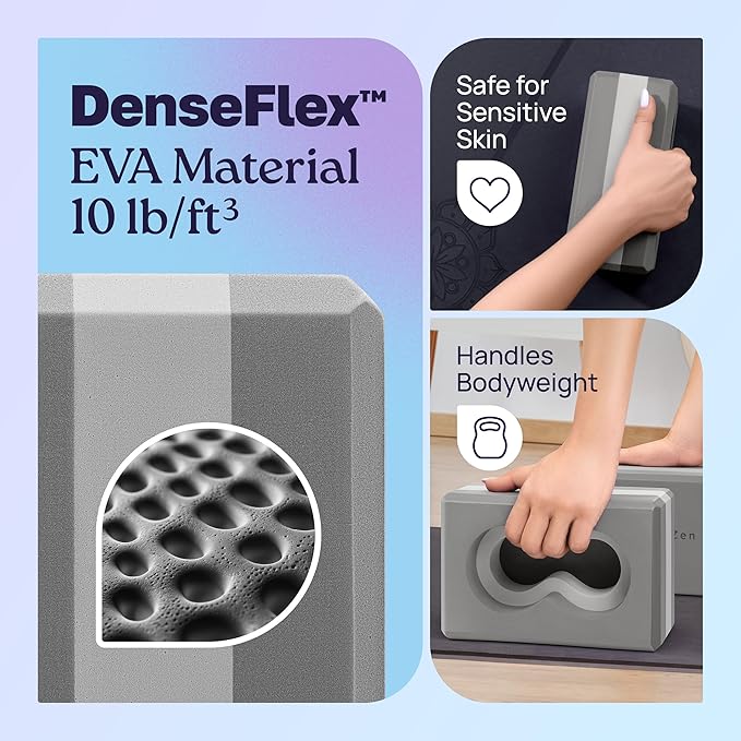 - PREMIUM DENSEFLEX MATERIAL: The yoga bricks 2 pack is made of enhanced-density “foam rubber” EVA that supports your weight while remaining soft to the touch, Each thin yoga block is built to ensure that your props do not compress under the pressure