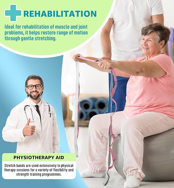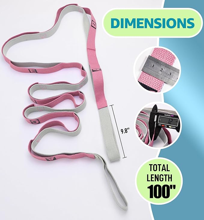 - 14 Independent Loops for Versatile Use: Featuring 14 independent loops, this strap offers unparalleled versatility for all your stretching needs. Easily adjust your grip to target different muscle groups, enhance your yoga poses, or assist in physical therapy exercises. The loops are designed to accommodate all hand sizes, ensuring a comfortable and secure hold, making it perfect for yoga, Pilates, and physical therapy.