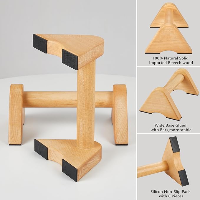 - Quality Beech Wood Parallettes Bars: This triangle wood push- up bars made of imported solid beech wood, not plastic or cheap wood sets, strong and durable and the wood material touch not too cold or stiff.
