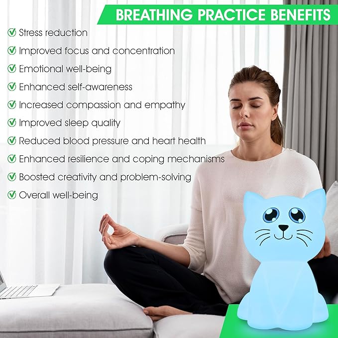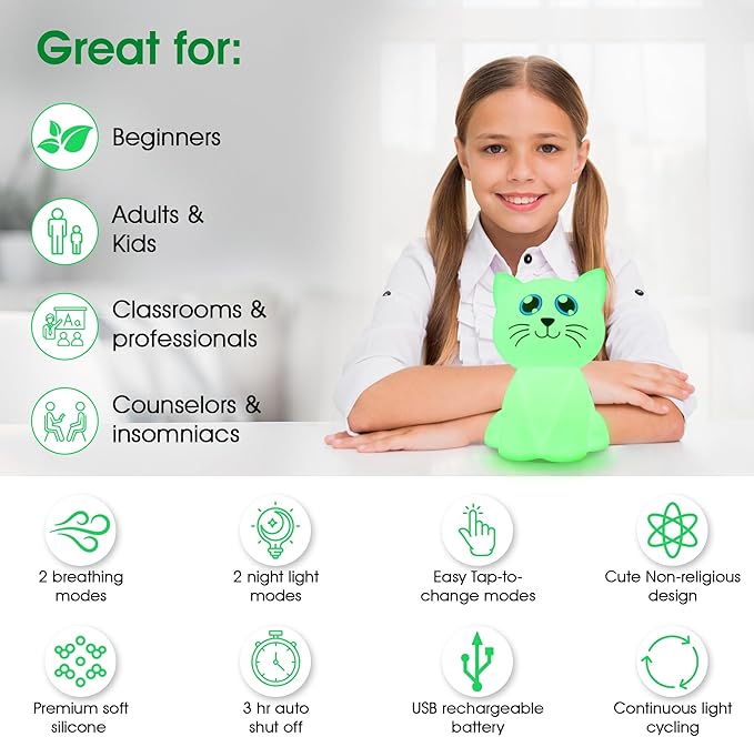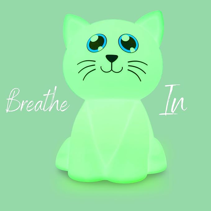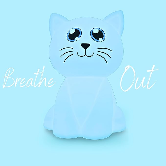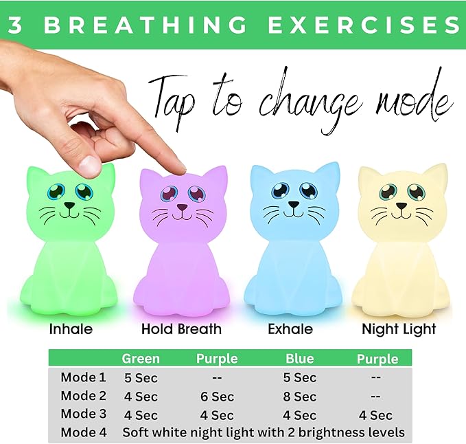 - HOW TO USE IT: Easy-to-use modes with color prompts: Green Cat for inhale, Purple Cat for hold, Blue Cat for exhale. Tap to adjust brightness.