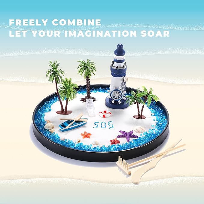 - [Kit Contents]:The kit includes a 10.5-inch diameter round tray, 1.1 pounds of specialized quartz sand for Zen gardens, 0.6 pounds of sea blue glass beads, a set of island-themed simulation models: a lighthouse, three different coconut trees, three starfish, and a bag of seashells. It also comes with a set of Zen garden tools and two mini sieves for separating sand and seawater.