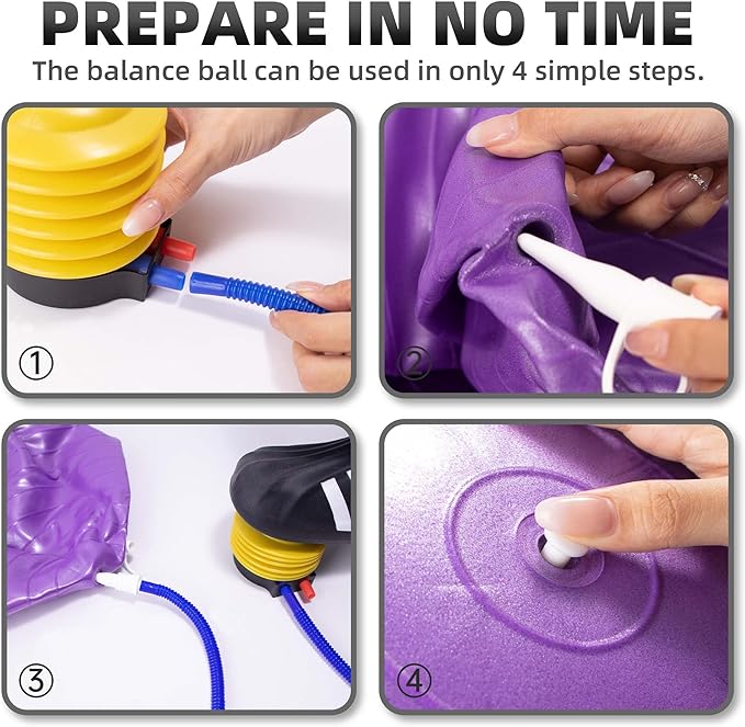- 【Convenient To Use】You will get a free air pump,tubing,air pull-out and two air plugs in the package!You can inflate the yoga ball easily and deflate it whenever you stop using it.
