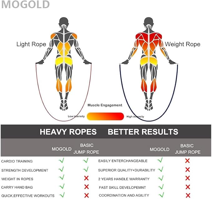 - Jump Rope Weighted Design: These jump ropes feature 1/2 lb weighted rope cable for an intense cardio and strength training workout.
