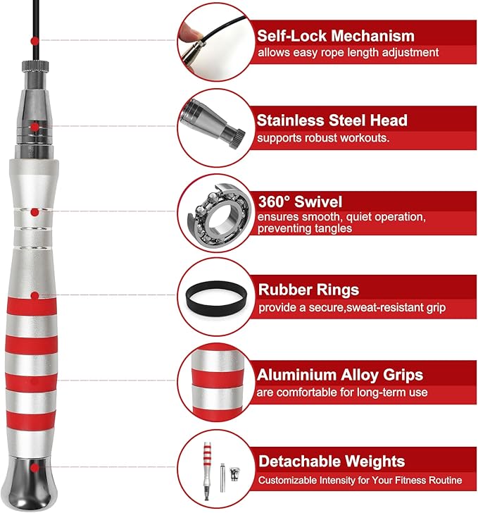 - Enhance your training with our detachable weighted handles (1.05 ounces each). Simply add or remove weights to increase or decrease resistance, boosting your endurance and strength. This innovative weighted jump rope is a versatile tool for fitness enthusiasts aiming to elevate their workouts to a new level.