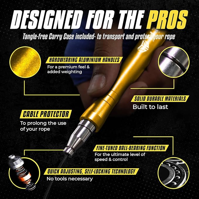 - PREMIUM QUALITY & DESIGN – We’ve used the highest quality components to make our jump rope. Using ergonomically designed aluminium handles for durability and weight, two cable thicknesses for alternative levels of skipping, cable protectors to prolong the life and a tangle-free carry case.