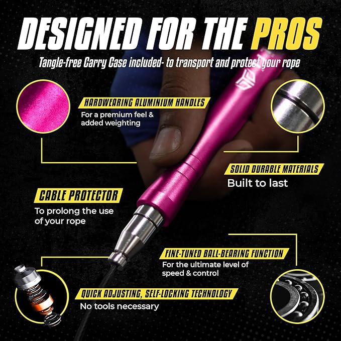 - PREMIUM QUALITY & DESIGN – We’ve used the highest quality components to make our jump rope. Using ergonomically designed aluminium handles for durability and weight, two cable thicknesses for alternative levels of skipping, cable protectors to prolong the life and a tangle-free carry case.