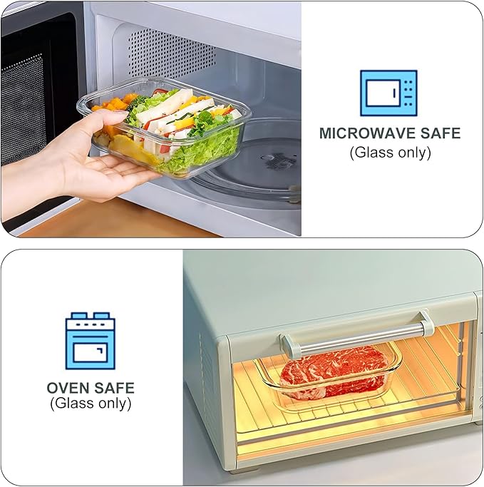 - High Quality Glass: Made from premium quality borosilicate glass, these glass meal prep containers are microwave, freezer, and oven safe, allowing you to conveniently heat up your meals, freeze leftovers, or even bake and reheat dishes, ideal for daily use. Please take off the lids when heating your meals.