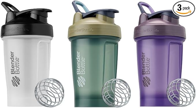 BlenderBottle Classic V2 Shaker Bottle Perfect for Protein Shakes and Pre Workout, 20-Ounce (3 Pack), Black, Tan/Blue, Purple