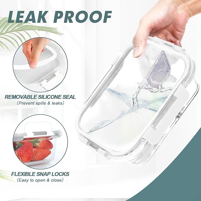 - HIGH QUALITY GLASS: Made from premium borosilicate glass, our meal prep containers are freezer, microwave and oven safe. The sturdy glass won’t stain, warp, or absorb odors, providing durability for storing and reheating your meals. Note: Please remove the lid before heating.