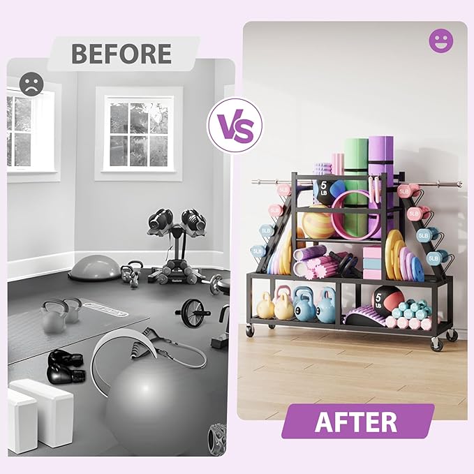 - 【Storage Various Items】Stores dumbbells, kettlebells, yoga blocks, resistance bands, Pilates bars, jump ropes, balls, maximizing space in home gyms, yoga studios, or garages with a streamlined storage solution.