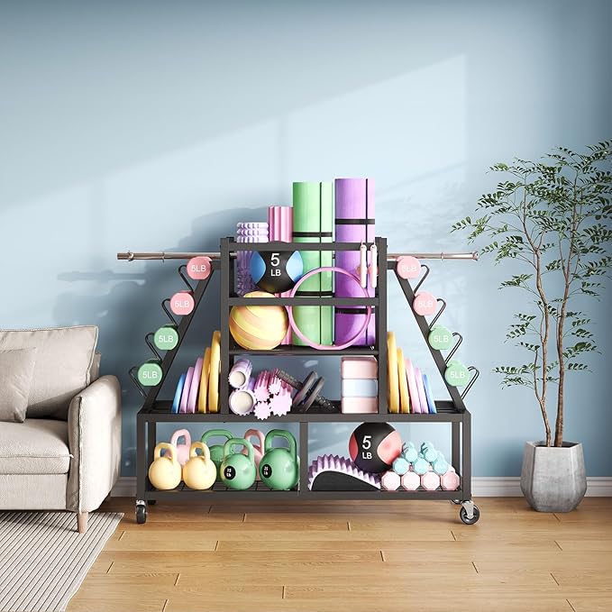 - 【Extra-Large Home Gym Storage Rack】This versatile workout organizer features a 3-tier design with dedicated storage zones. The sturdy A-frame sides securely hold up to 4 pairs of dumbbells for easy access, while the middle shelf stores yoga wheels, blocks, and additional weights. The bottom platform accommodates bulkier items like barbell plates, kettlebells, resistance bands, and exercise balls. Its space-saving design keeps your workout area clutter-free while providing quick access to all your fitness gear.