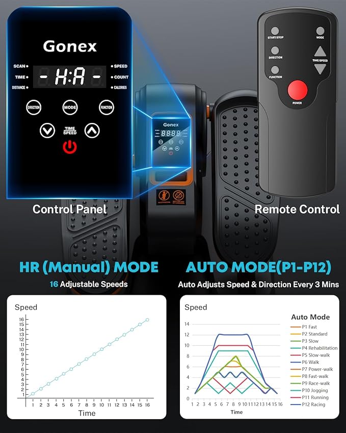 - Manual 16 Speed Levels & Auto Mode: Gonex strength training ellipse leg exercise machine has manual mode (16-level speed) and automatic mode (P1-P12) for your choice to satisfy your various needs. And the pedals can move forward or backward for a more well-rounded leg muscle workout