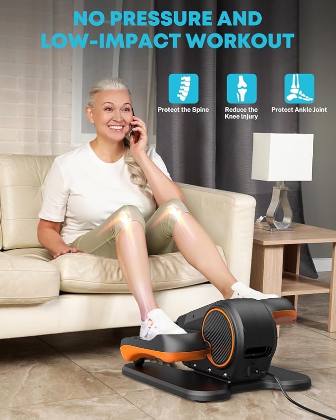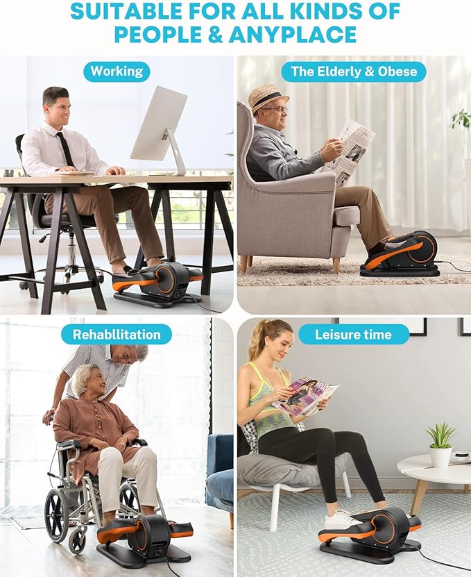 - Low-Impact & Zero Pressure: Low-impact under desk elliptical machine is friendly & safe for seniors and people in leg rehabilitation. This exerciser can promote blood circulation, relieve muscle tension, prevent fascia adhesion and varicose veins, help legs recover quickly, and burn calories to lose weight