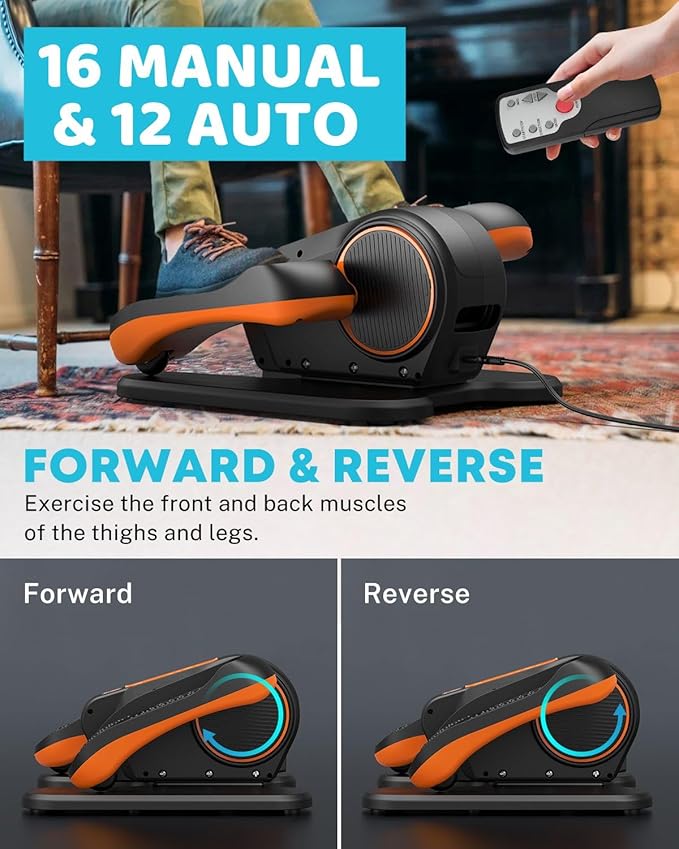 - Remote Control & Digital Monitor: Our electric ellipse leg exerciser is controlled by the remote & LED screen. Remote control facilitates the seniors to adjust without bending over, protecting their waist & back.And the LED screen can display exercise data (time, distance, speed, calories, counter) in real time