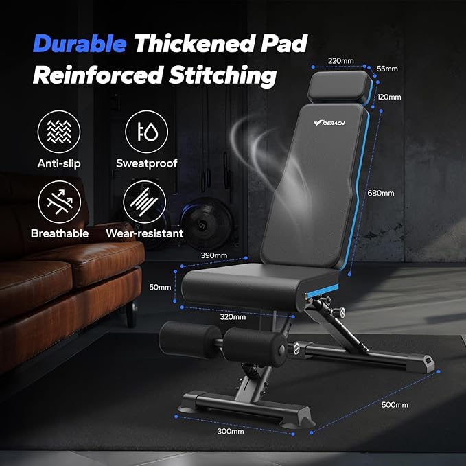 - [High Weight Capacity] MERACH workout Bench for Home Gym supports up to 990 lbs, crafted from heavy-duty steel for unmatched stability and durability, perfect for intense workouts. This weight bench is essential workout equipment for anyone serious about their home gym.